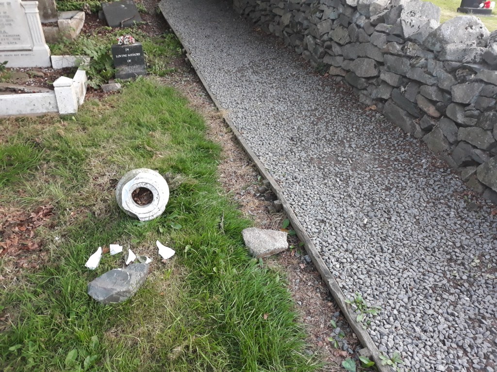 A youth seemingly took pot shots at some of the monuments on the south side of the public footpath by throwing granite rocks at them. The top of one monument, an urn dedicated to Arthur Hurd, has been broken into several pieces, and another dedicated to Thomas and Lucy Ellen Smith is slightly damaged. Â