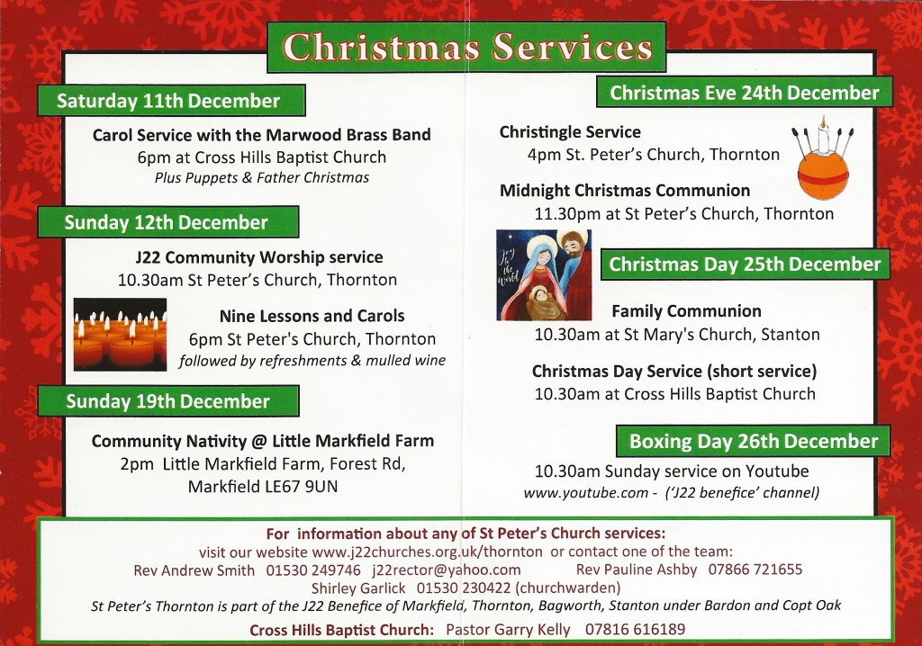 St. Peter’s will be open on Friday 10th December, 2pm – 7pm for you to bring your tree into the church and decorate it. You will be allocated your space on arrival. If you need to come outside of those times, please contact Sue; email suembakewell@gmail.com / telephone 01530 231625 to arrange a mutually convenient time.