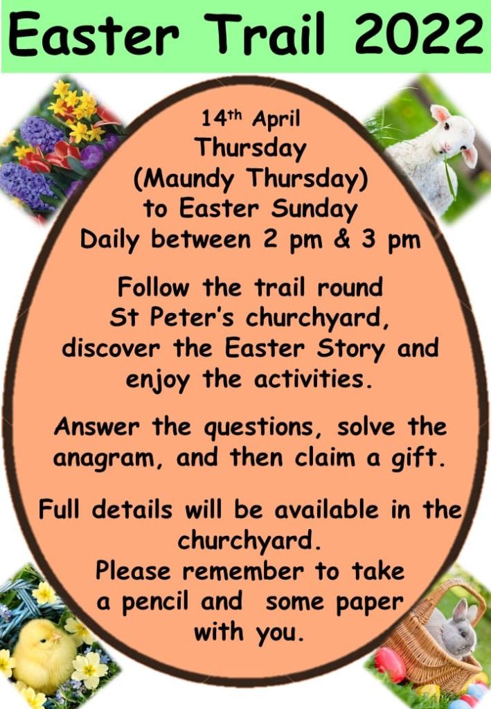 Don’t forget the Easter Egg Trail in St Peter’s churchyard from tomorrow until Easter Sunday.