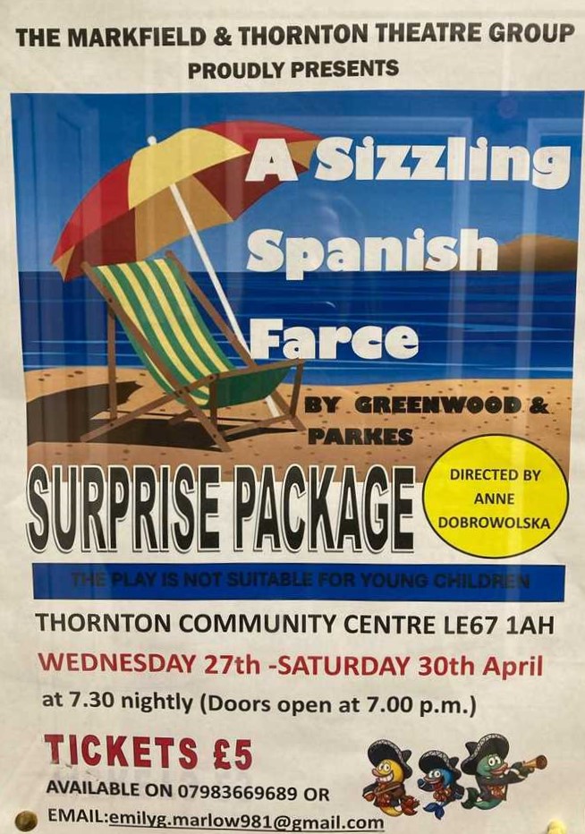 Markfield & Thornton Theatre Group are entertaining us again with “Surprise Package” a comedy set in Spain in the 70’s involving two unsuspecting British families.