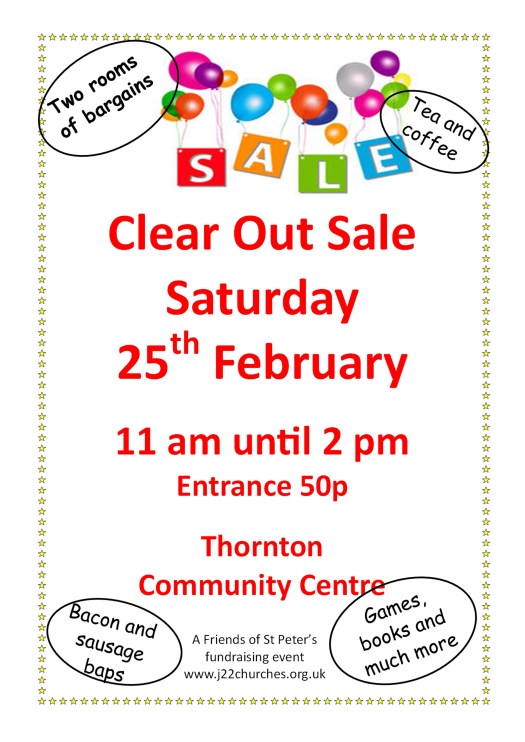 Clear Out Sale Saturday 25th February 11 until 2 pm Thornton Community Centre