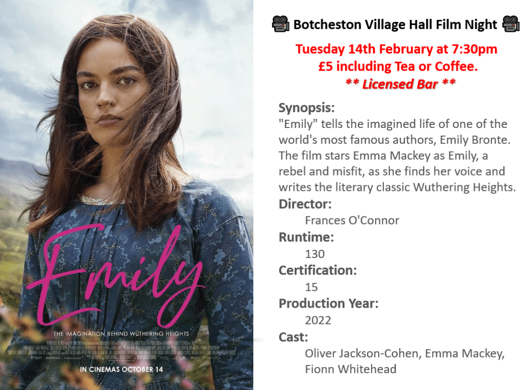 Our next film at BVH is ‘Emily’ – rebel and misfit Emily Bronte finds her voice and writes Wuthering Heights, the classic tale of undying love and tormented passion.