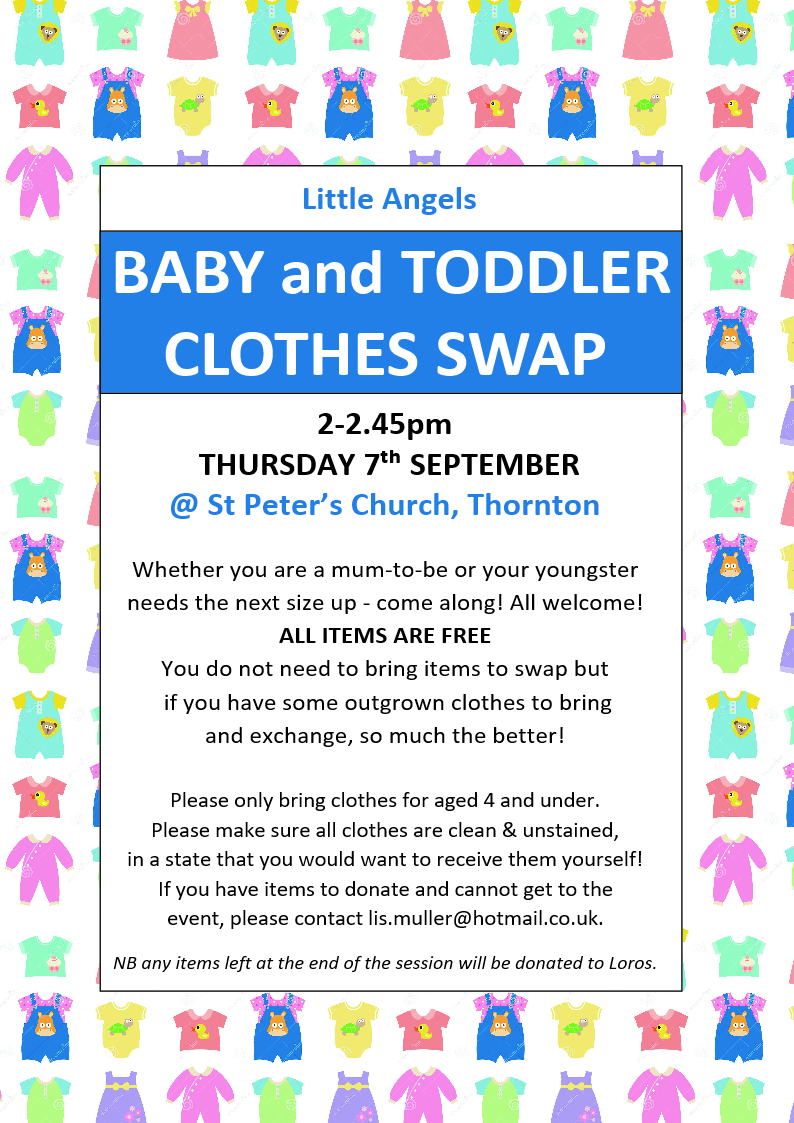 So, the ‘Little Angels’ group is organising a BABY and TODDLER CLOTHES SWAP at St Peter’s Church in two weeks’ time. Spread the news and see you there!
