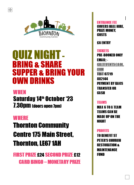 Coming to Thornton Community Centre, Leicestershire on Tuesdays from this October.