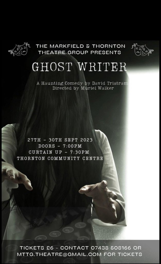 “GHOST WRITER” is to be staged at THORNTON COMMUNITY CENTRE from Wednesday 27th to Saturday 30th September at 7:30PM nightly. Tickets are priced at £6 and are available from on 07438 508166 or by contacting mttg.theatre@gmail.com.