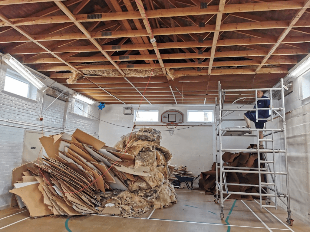 To remove the Sports hall ceiling tiles, insulation and the brown felt wall and ceiling covering.