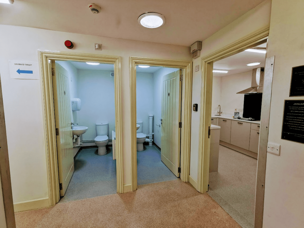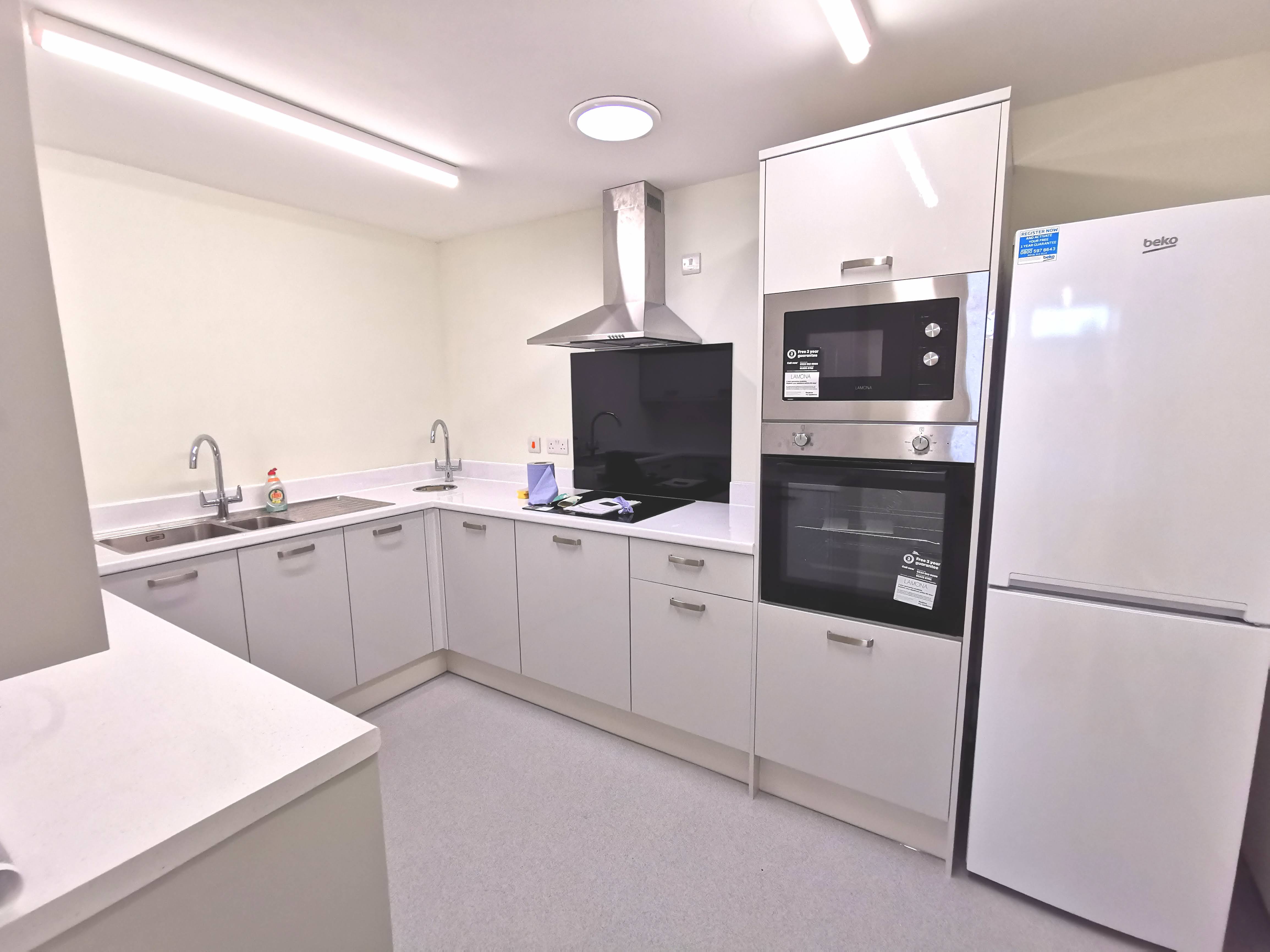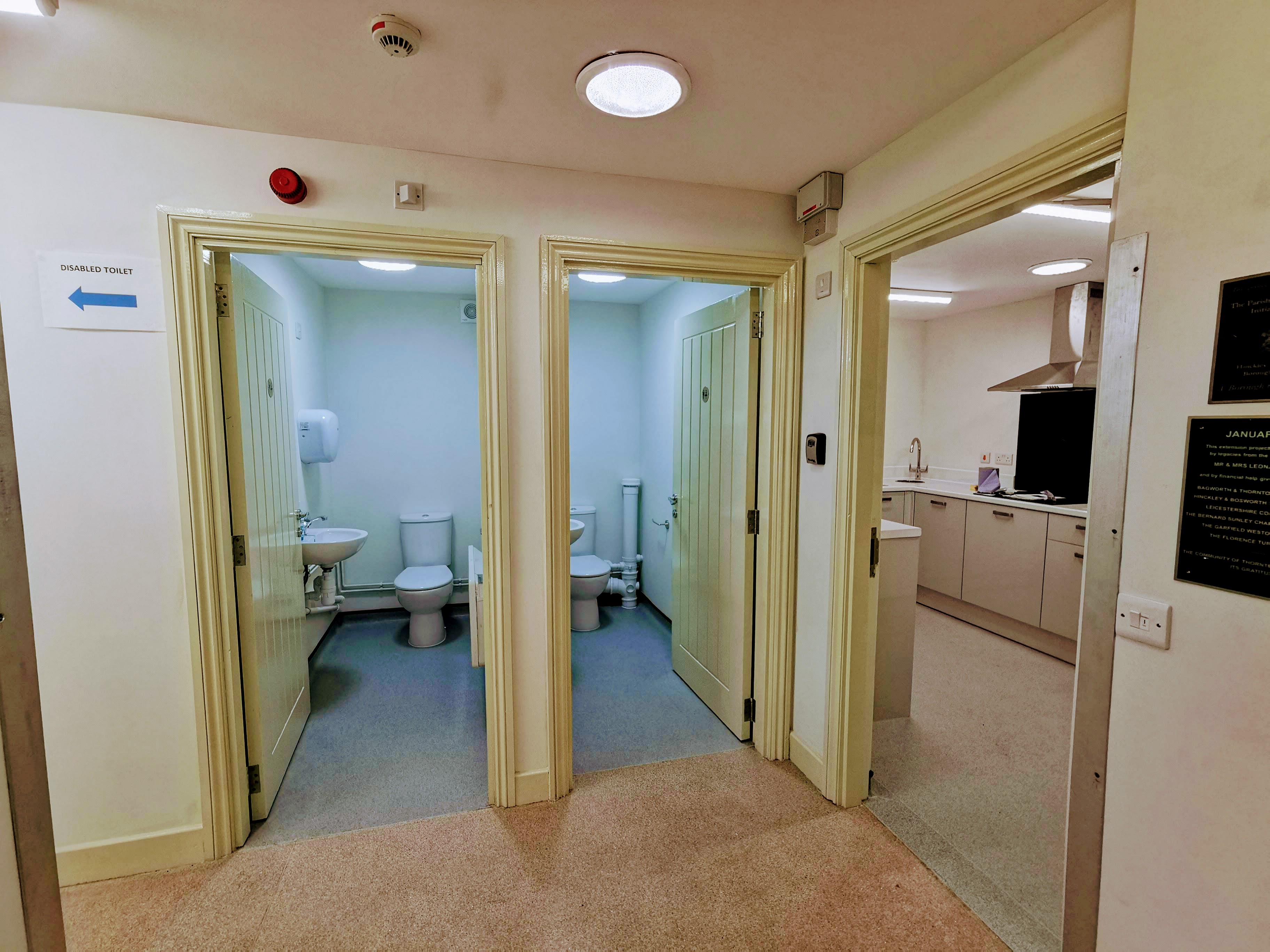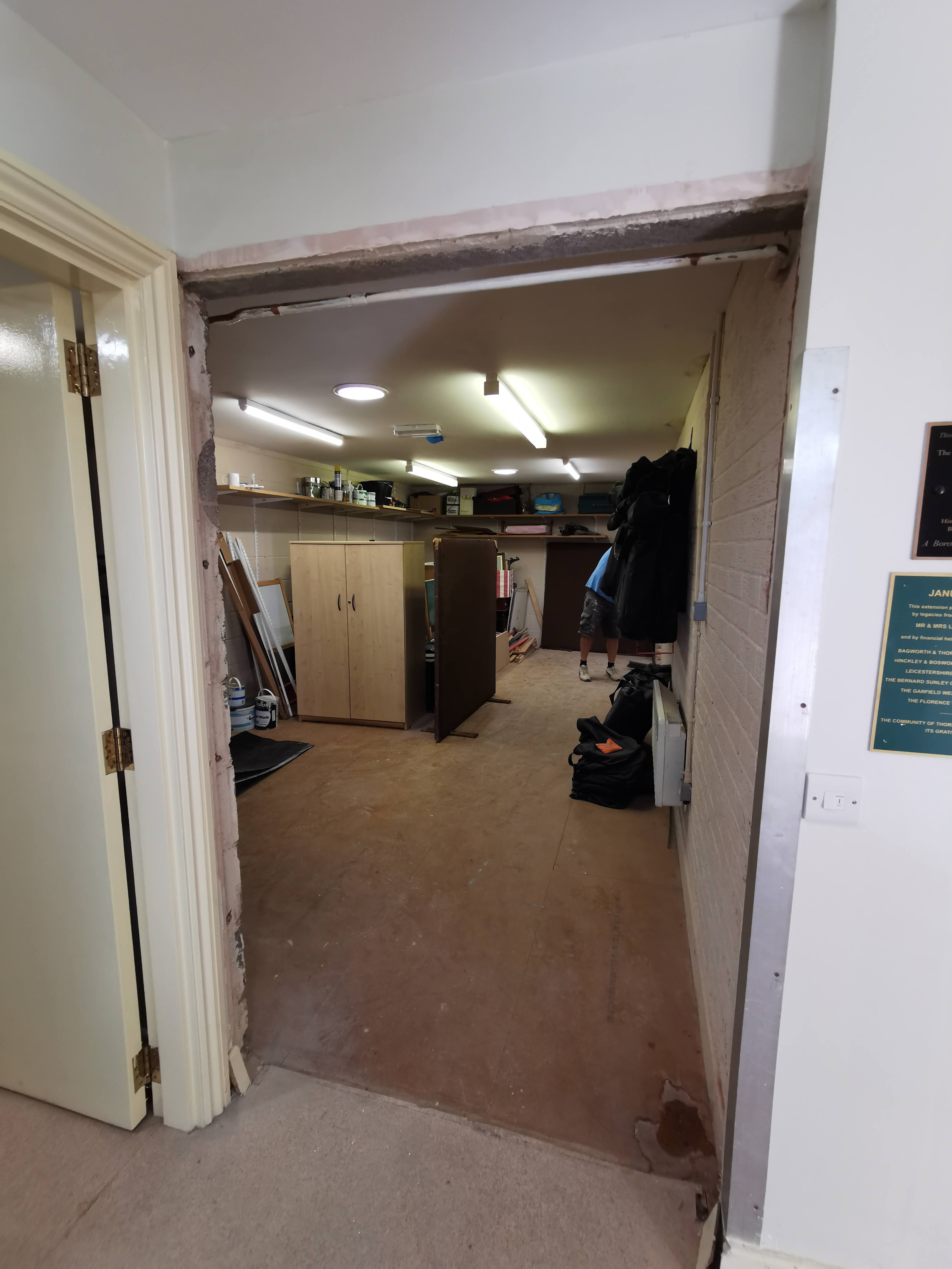 To provide two unisex toilets in the Sports Hall (additional to the disabled toilet) by utilising the space of the existing small kitchen and using a third of the Sports Hall storeroom space for a new modern, fully equipped kitchen with eye level oven and microwave, induction hob, and large fridge freezer. (Tim Baker TLB Construction Ltd).
