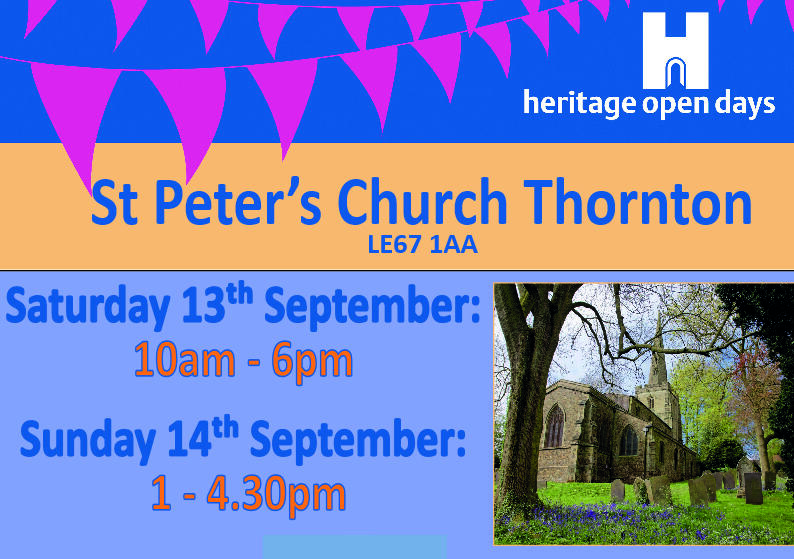 Whether you have links with Thornton or are a lover of local history, we invite you to our Heritage weekend, being held at St Peter’s Church in Thornton (LE67 1AA) on: