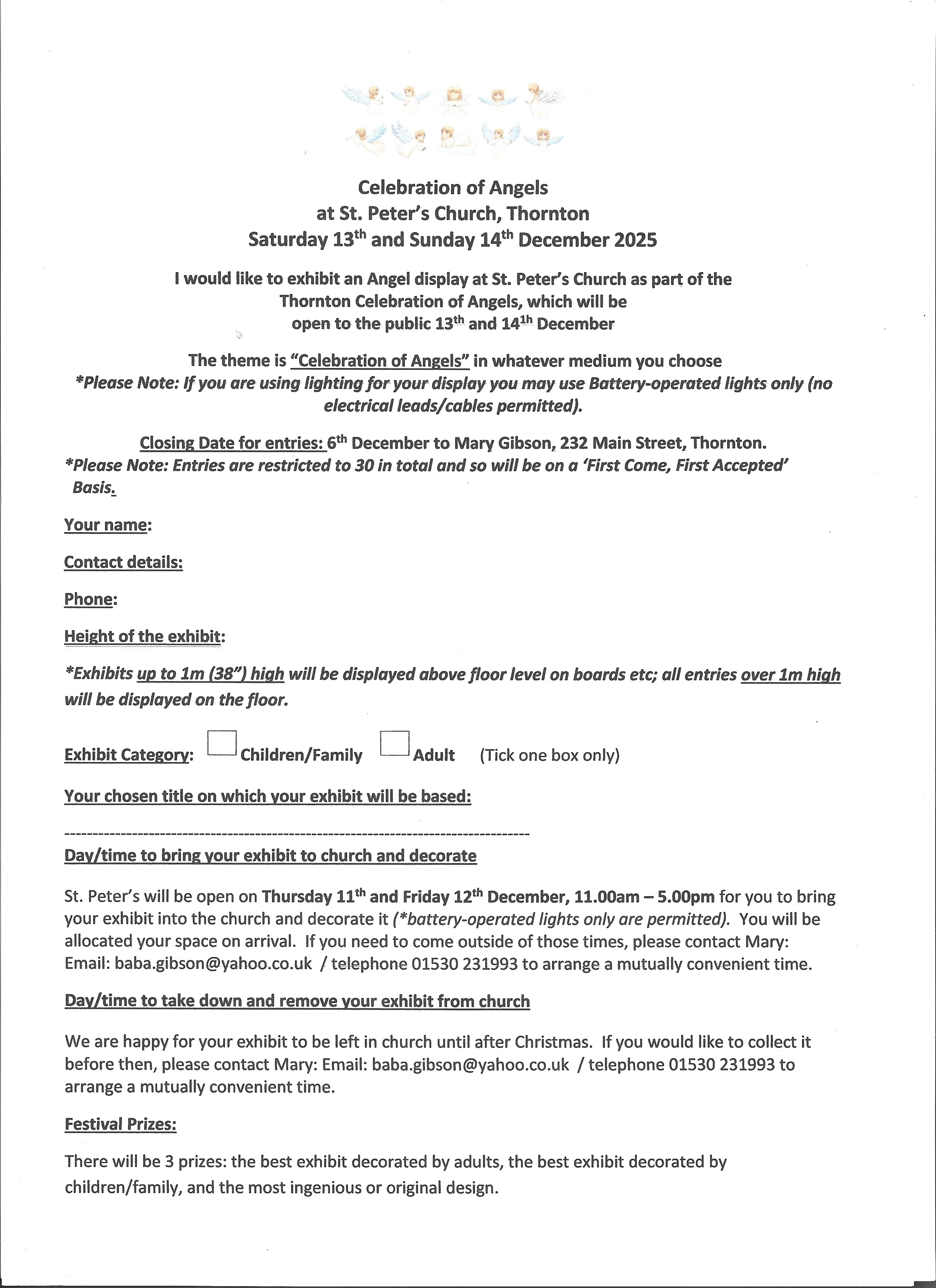 This year we are celebrating angels at St Peter’s church, Thornton during the weekend of 13th and 14th of December.