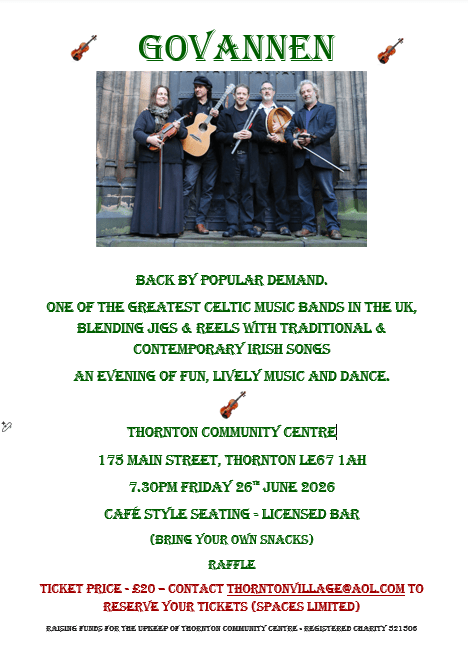 Space is limited at the Centre, so to avoid disappointment – email thorntonvillage@aol.com to reserve your tickets now.