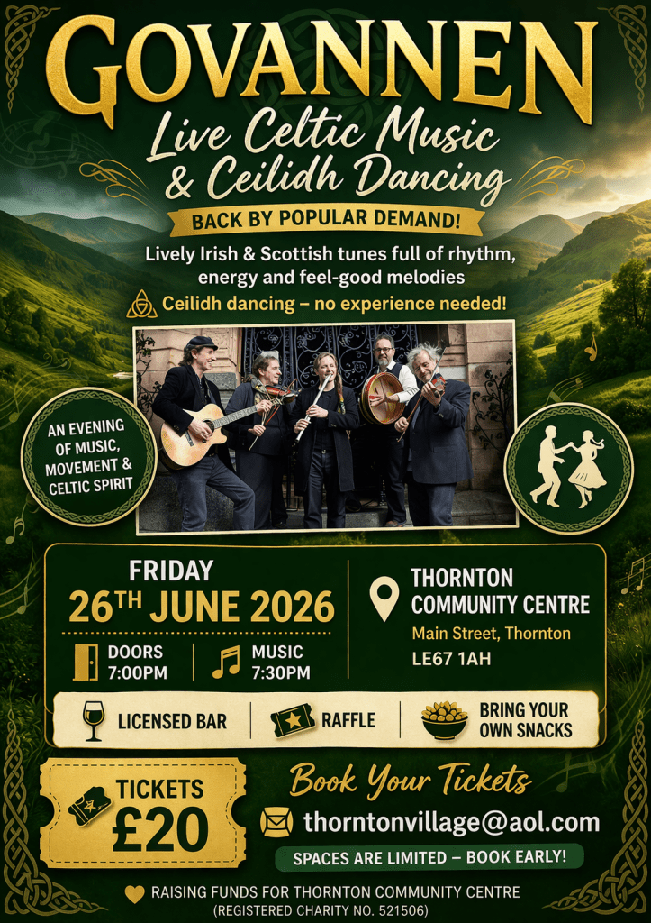 The festival will commence on Friday evening with a special ticketed performance by renowned Celtic music band Govannen. Tickets are priced at £20 and must be booked in advance via thorntonvillage@aol.com. Tickets are selling fast – don’t delay in booking yours!