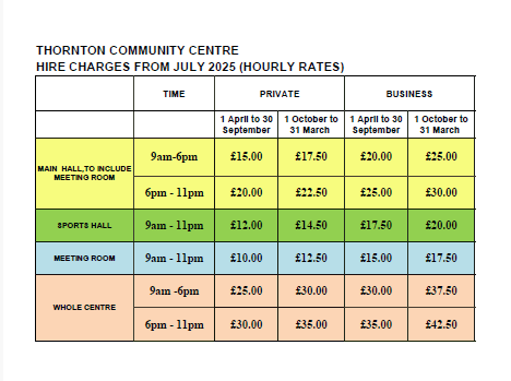 Please note – it has become necessary to request a deposit against extra cleaning and time taken to close up the centre, particularly after late night parties, where the hall has been left in a mess and the furniture left stacked dangerously. Should the party/hirer not be ready to leave at the agreed time on their booking – an additional charge will be made for every 15 mins extra time taken to clear away.