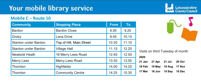 The mobile library visits Thornton in the afternoon on the third Tuesday of every month.