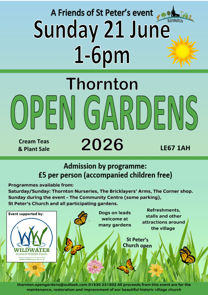 Programmes will be available from Thornton Nurseries, The Bricklayers Arms, The Corner Shop. St. Peter’s Church, all participating gardens and the Community Centre.